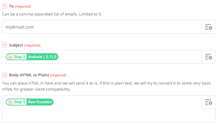 - Remplissez le champs To avec votre adresse email, Subject avec Step 1 Title et Body avec Step 1 Raw Encoded body